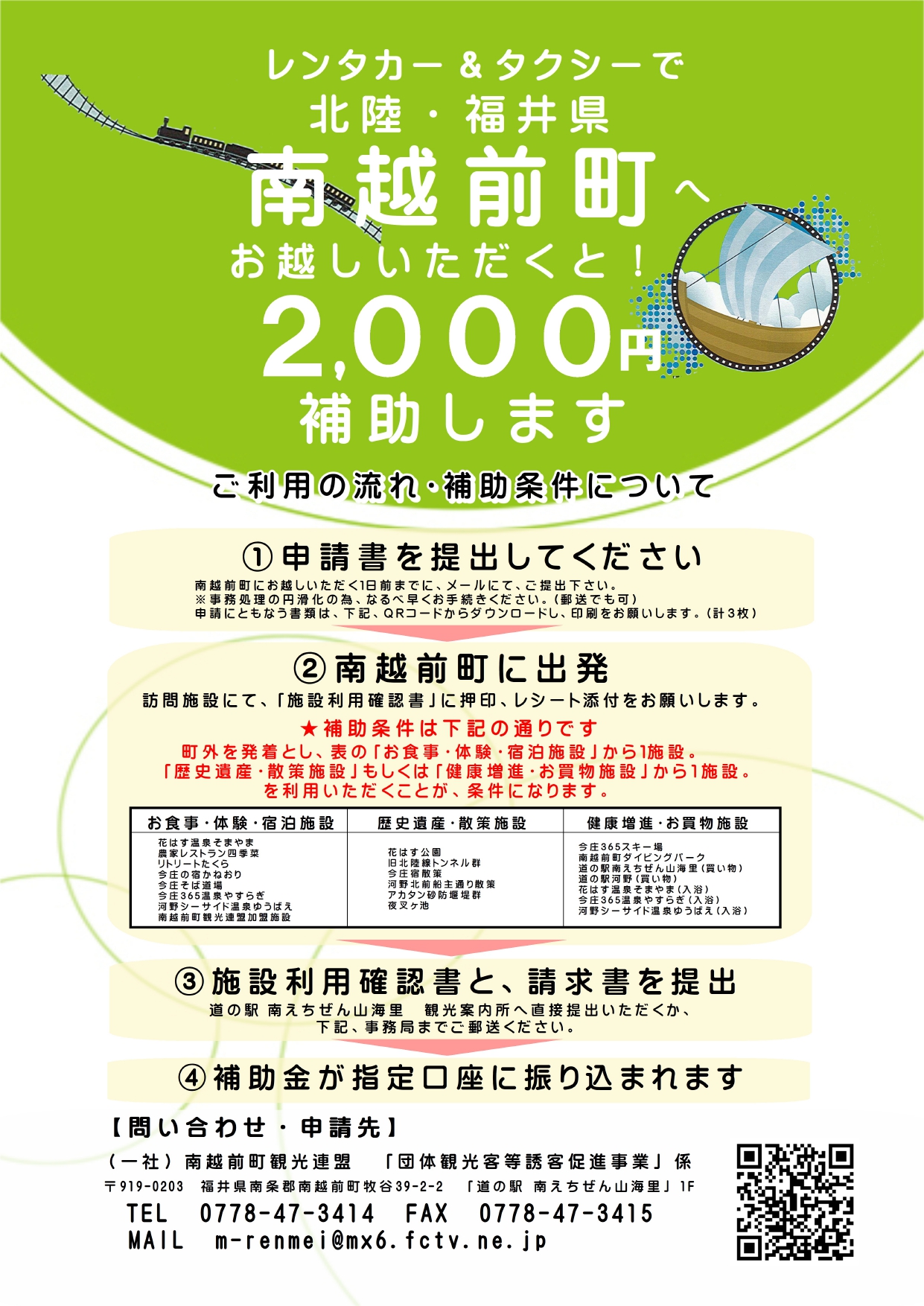 ご利用の流れ・補助条件は南越前町観光連盟様ホームページでご確認ください。